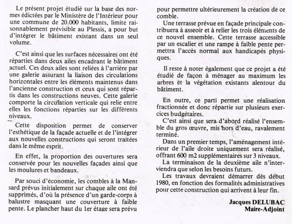 "Chaque nouveau plesséen admire sa charmante mairie, dans son cadre de verdure, vestige d'une architecture passée. Mais, dès le seuil franchi, la déception remplace l'admiration. Accueilli dans une pièce triste, par des employés retranchés derrière de hauts guichets, obligé de se plier pour se faire comprendre et obtenir le renseignement demandé, l'administré regrette amèrement qu'un accueil plus chaleureux, dans un cadre moderne égayé par quelques fleurs, ne lui soit pas réservé. A l'étroit, nous le sommes réellement : un seul bureau pour le maire et ses adjoints. A sept, nous travaillons dans une même pièce. Faute d'espace, les services municipaux et l'appariteur sont relégués à la cave...
