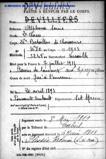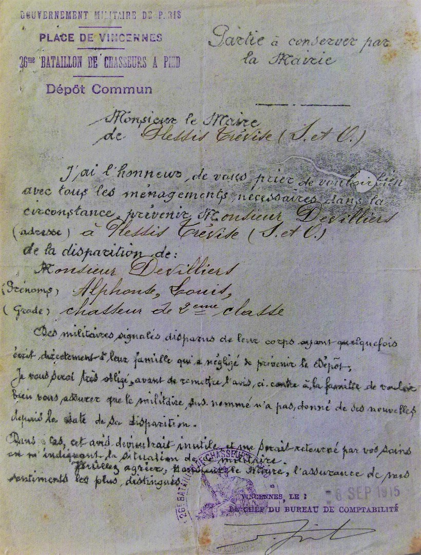 Courrier du gouvernement militaire de Paris – Annonce disparition Alphonse Devilliers (source AD94)