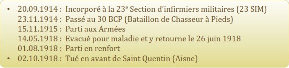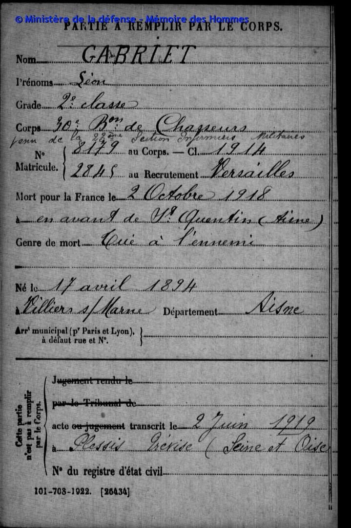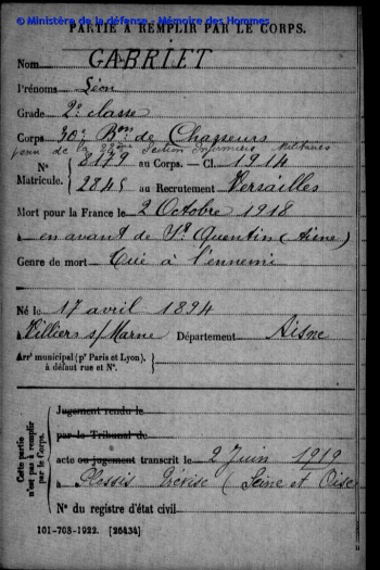Eugène Gabriet, frère de Léon, a été incorporé le 19 décembre 1914. Il fut porté disparu le 2 août 1915 au Bois de la Gruerie - cote 213. En réalité, il avait été fait prisonnier ce même jour et conduit dans le camp de Darmstadt en Allemagne. Il sera rapatrié le 30 novembre 1918.
