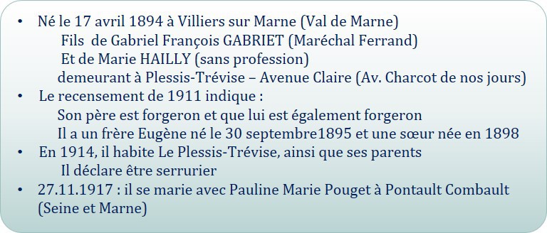 La famille Gabriet était bien connue au Plessis-Trévise. Gabriel Gabriet ou plutôt François comme il se faisait appeler fut certainement l'un des premiers artisans du Plessis-Trévise. Il avait sa forge avenue Claire (renommée avenue Charcot). Il réalisa par exemple la grille entourant le Monument aux Morts en 1921, la grille de la mairie en 1923 (qui sera déplacée plus tard à l’école de musique César Franck)...