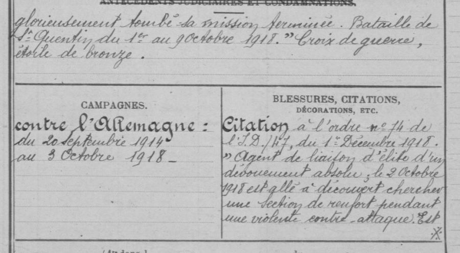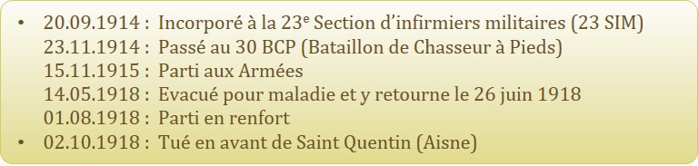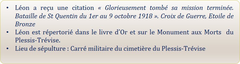 Placé le 4 avril 1919 en sursis d’appel jusqu’au 30 septembre 1919, à la disposition de Plessis-Trévise, il se retira au 2, avenue Claire au Plessis-Trévise, donc chez ses parents où il restera encore au moins jusqu'en 1936.