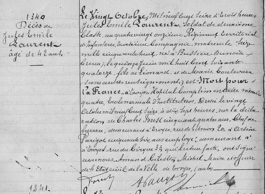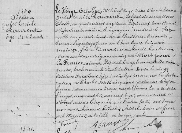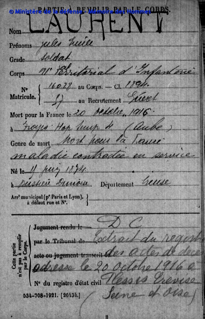 Acte de décès de Jules Emile Laurent à Troyes - 20 octobre 1916