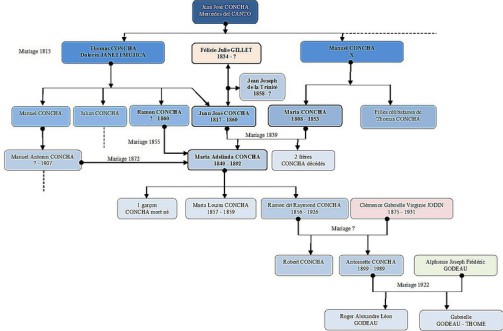 "en 1838, don José Concha servait comme sous-lieutenant dans l'armée chilienne qui occupait alors le Pérou. Il se trouvait en garnison à Lima où habitait dona Maria sa cousine. Le jeune officier s'éprit d'un vif amour pour sa cousine et se résolut de l'épouser. Compliqué, car d'un coté, il y avait l'empêchement canonique dû au degré de parenté et de l'autre, le sous-lieutenant était officier dans l'armée d'occupation. La solution n'était-il pas de contracter un mariage clandestin ? ce qui fut fait, les deux amants se mariant sous de faux noms. Adelinda naitra ensuite de cette union. "