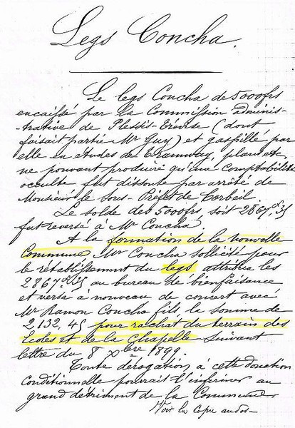Elle institue ainsi un legs de 5 000 francs (soit environ 20 000 euros de nos jours). Ce legs fut utilisé par la Commission Administrative du hameau en de vaines études et plans en vue de la construction d'une ligne de tramway. Considérant que cet argent avait été gaspillé, que la comptabilité était occulte, le sous-préfet de Corbeil dissout cette Commission. Le solde du legs soit 2 867,35 francs est alors reversé à M. Ramon Concha, fils de la défunte Adelinda. Celui-ci, respectant pleinement la volonté et l'esprit généreux de sa mère, reverse immédiatement cette somme à la toute nouvelle commune du Plessis-Trévise, l'autorisant, par courrier du 8 décembre 1899, à utiliser cette somme pour constituer les premiers fonds du bureau de bienfaisance. Il y ajoute, généreusement lui aussi, pour compléter le don d'origine, la somme de 2 132,45 francs dans le but de racheter le terrain sur lequel ont été construits la chapelle et l'école.