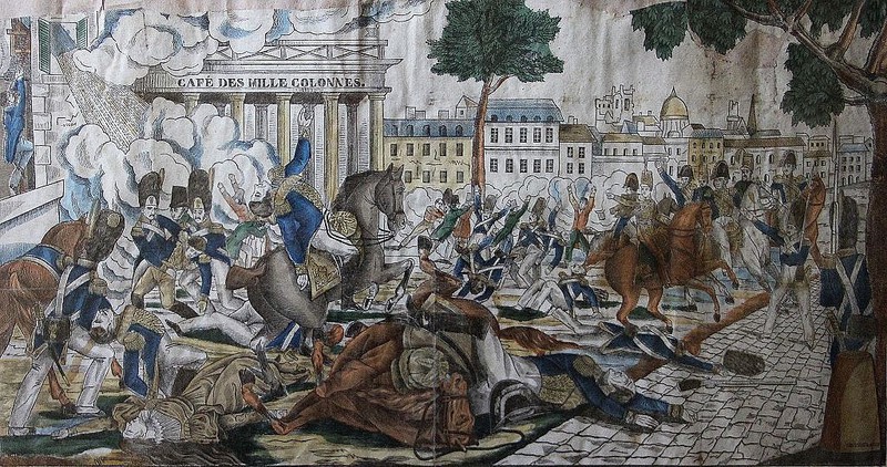 Le cortège était parvenu au boulevard du Temple lorsqu’au travers d’une croisée, un jet de fumée apparut. L’on entendit un crépitement rapide et saccadé comme un feu de peloton. La monture du souverain, blessée au cou, se cabra. Le maréchal Mortier atteint à la tête, tomba tué sur le coup au travers du cheval de Rambuteau. L’anarchiste corse Fieschi venait de se servir de sa machine infernale. Vingt quatre canons de fusils, alignés sur un châssis incliné et partant en même temps, avaient fauché vingt personnes, sans atteindre leur but.