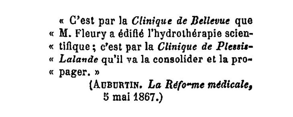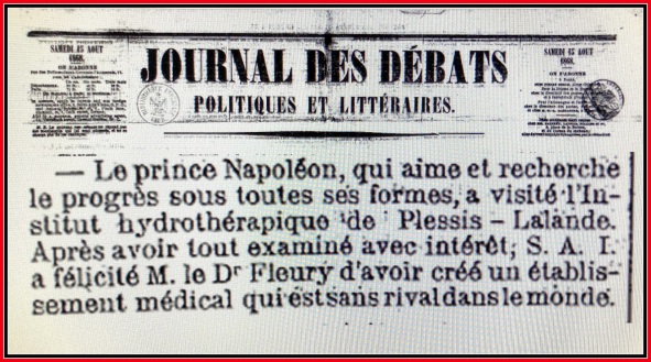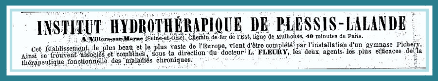 La réputation du docteur Fleury et de son Institut, innovant et de haute technologie pour l’époque, attirent une clientèle nationale et internationale aisée qui se presse au Plessis-Lalande. Cette même année, l’Exposition universelle du Congrès médical de Paris vient asseoir sa réputation, engageant de nombreux praticiens à venir visiter son établissement modèle.