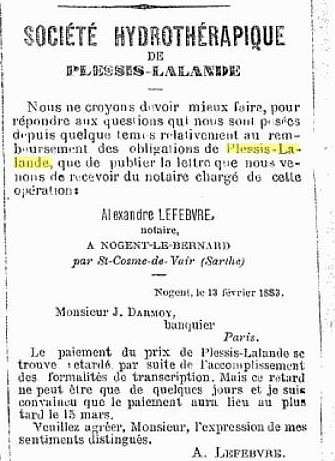 En 1867, il loue le domaine de La lande au ténor Gustave Roger et installe à grands frais un «Institut hydrothérapique dans les dépendances du château : L’installation hydrothérapique est au niveau de la beauté du site et de la résidence. La salle de douches est un élégant salon, ou plutôt un amphithéâtre scientifique d’un grand caractère […]. Des rochers couverts de plantes alpestres forment une superbe grotte où se trouve une vaste piscine alimentée par une cascade et par une lame d’eau… ».